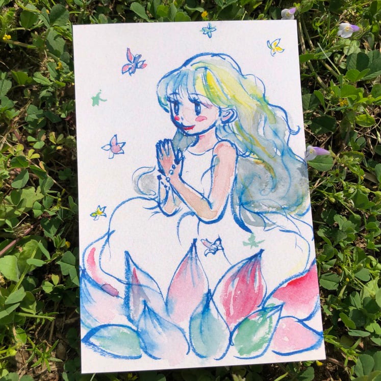 水彩画のオリジナル絵はがき3枚セット。 合掌少女A、合掌少女B、花仏さま。 額に入れて飾ると、心が安らぎます。大切な人へ書くお便りに最適のポストカード。