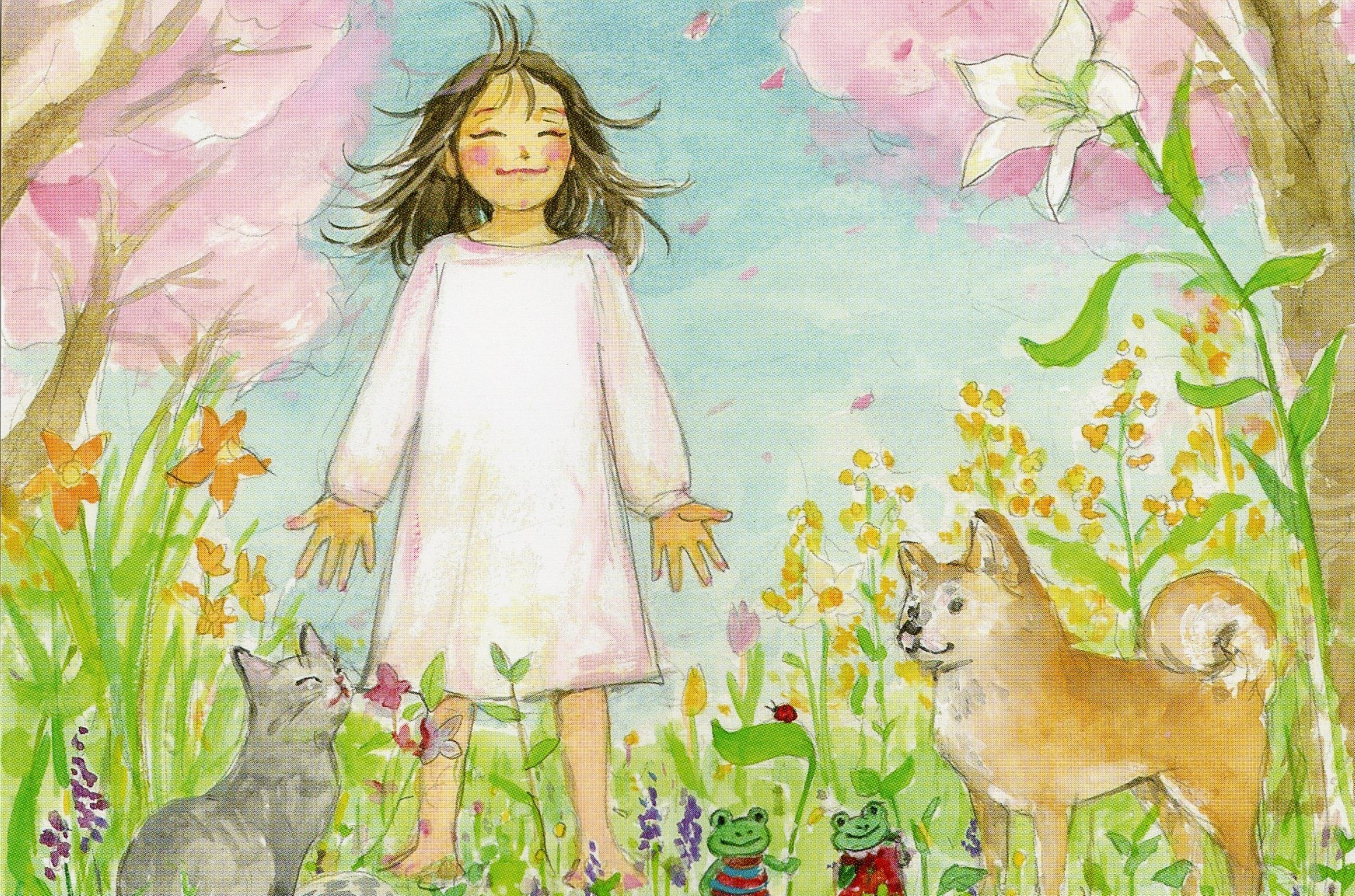 オリジナルデザインの春の息吹をいっぱい吸いこむ少女と動物たちの水彩画のポストカード。